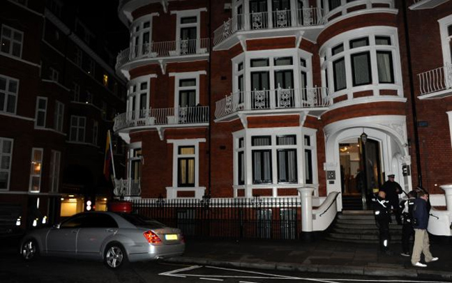 Στον Assange δόθηκε πολιτικό άσυλο από την πρεσβεία του Ισημερινού αλλά εάν βγει από υο κτήριο μπορεί να συλληφθεί.